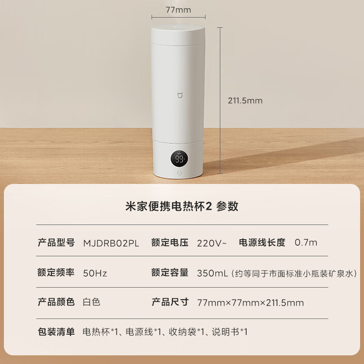 • 名称米家小米电热水杯加热杯热水壶 保温烧水杯 350ml迷你便携式旅行出差 智能恒温 316L不锈钢无异味 白色