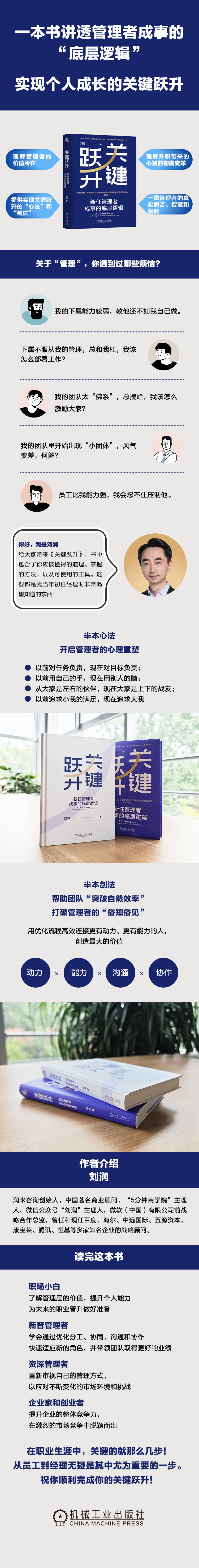 刘润:“我希望用一本书讲清楚,从‘自己完成任务’跃升到‘通过别人完成任务’,在这个全新的系统里,你应该懂得的道理、需要掌握的方法以及可以使用的工具。这些都是我当年初任经理时非常渴望知道的东西。”