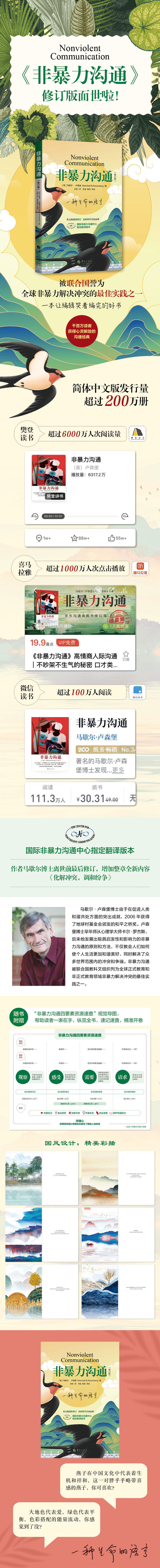 还有,大家是不是发现修订版的封面有点国风的感觉,哈哈,是的!马歇尔博士在《非暴力沟通》里整合了东西方的智慧,我们就想怎么能在封面中体现出东方味道呢?机缘巧合下发现了这一对胖乎乎略带喜感的燕子,而燕子在中国文化中正代表着生机和祥和。