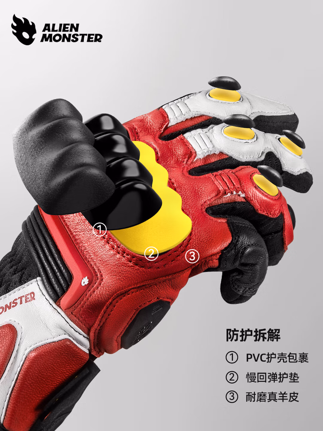 • 名称外星怪春夏季摩托车真皮手套防摔透气机车装备 驭风-红色【四季款】 XL